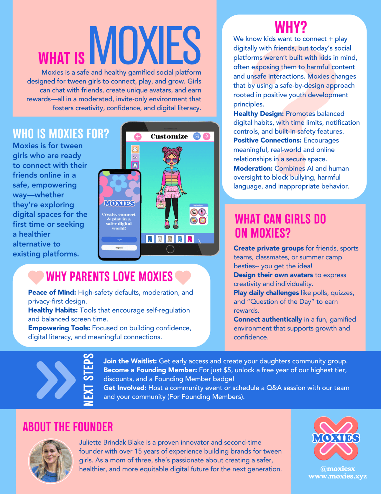 As we all know, current social platforms do not provide girls with the proper place to nurture these traits. That’s why we’re building Moxies- to encourage and amplify these qualities by harnessing the power of technology and community, helping each girl tap into her inner Moxie!