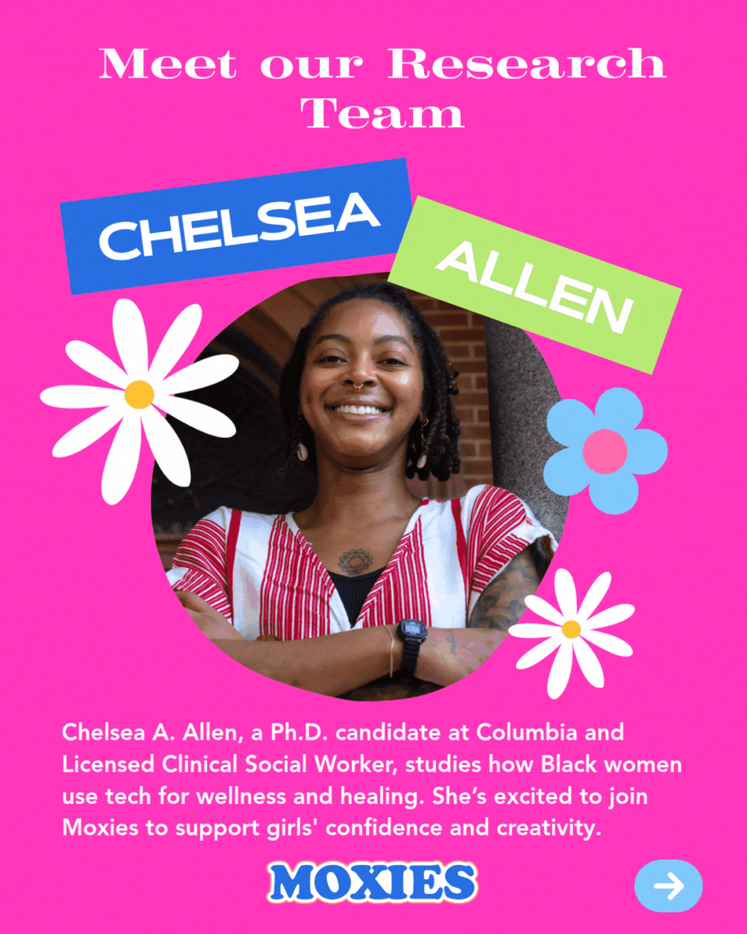 A Ph.D. candidate at Columbia and a Licensed Clinical Social Worker, Chelsea explores how Black women utilize technology for healing and empowerment. She brings that same energy to Moxies, championing confidence and creativity in every girl.